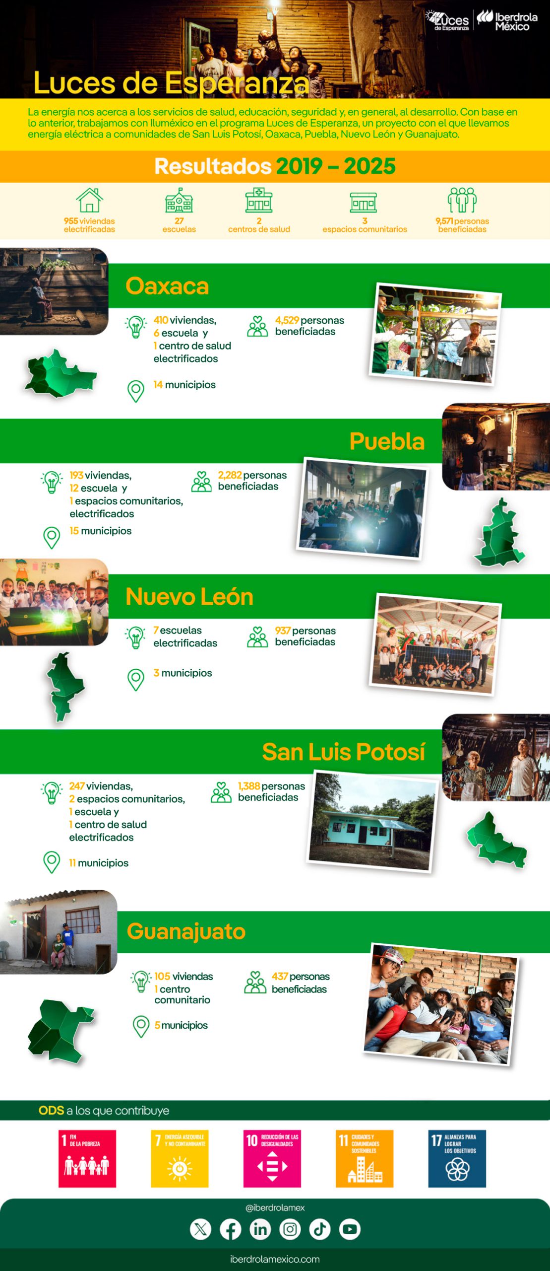 La energía nos acerca a los servicios de salud, educación, seguridad y, en general, al desarrollo. Con base en lo anterior, trabajamos con Iluméxico en el programa Luces de Esperanza, un proyecto con el que llevamos energía eléctrica a comunidades de la Huasteca Potosina, Oaxaca, Nuevo León, Puebla y Guanajuato.